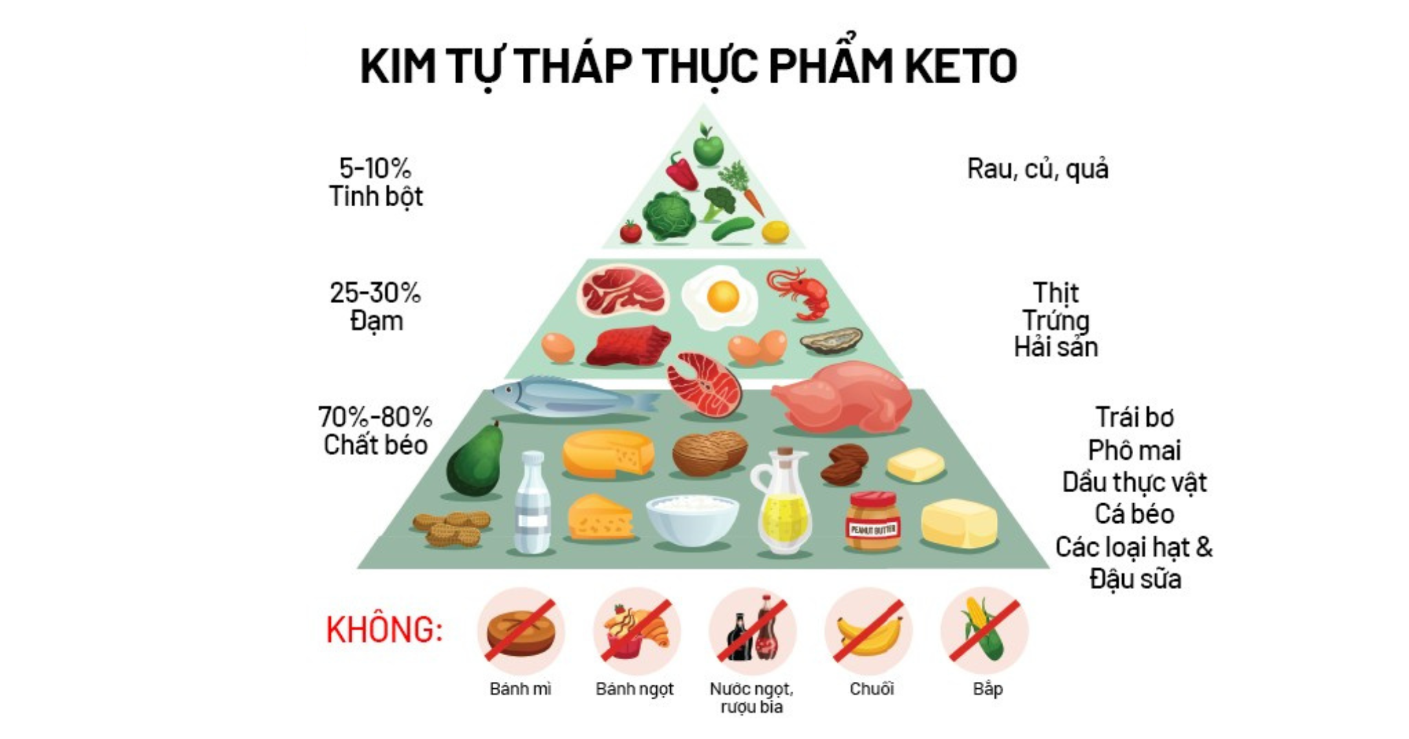 Một chế độ keto điển hình sẽ gồm khoảng 70–75% calo từ chất béo, 5–10% từ carb và 15–20% từ protein. Thực đơn keto thường bao gồm các thực phẩm giàu chất béo và đạm.  Như thịt, cá, trứng, bơ, dầu olive, phô mai, các loại hạt, cùng rau xanh ít carb. Ngược lại, người ăn keto phải hạn chế tối đa thực phẩm giàu tinh bột và đường. Ví dụ như cơm, bánh mì, mì pasta, khoai, các loại bánh kẹo ngọt, nước ngọt và hầu hết hoa quả nhiều đường. Nhìn chung, keto là một phiên bản rất nghiêm ngặt của chế độ Low-Carb. Buộc cơ thể chuyển sang dùng mỡ thay vì carb để tạo năng lượng.